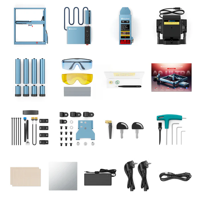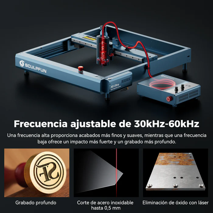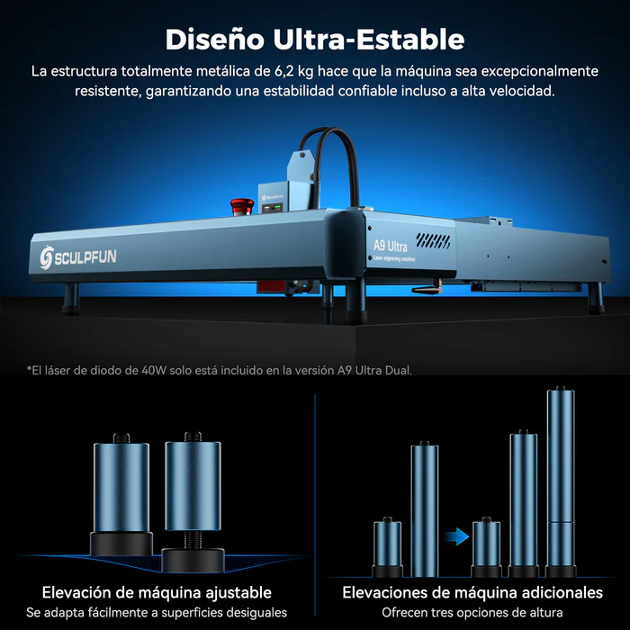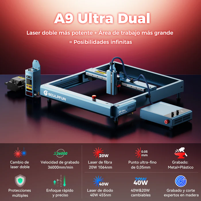 La A9 Ultra es una máquina de doble láser, con un láser de diodo azul de 40 W y un láser de fibra de 20 W. Puede grabar prácticamente cualquier material de uso diario.