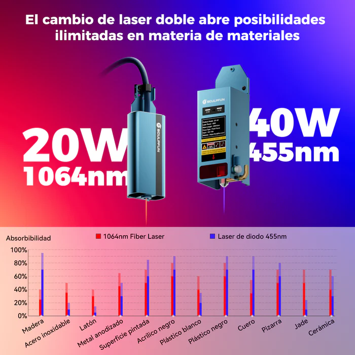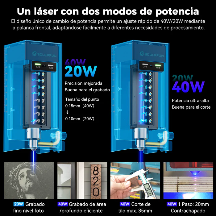 - Cambie fácilmente entre un láser de fibra de 20 W y un láser de diodo de 40 W, según las necesidades de su trabajo. El láser de fibra destaca por sus grabados nítidos y profundos en metales (acero inoxidable, latón, aluminio, etc.), mientras que el módulo de diodo proporciona potencia para cortar maderas gruesas, acrílico y otros materiales no metálicos.