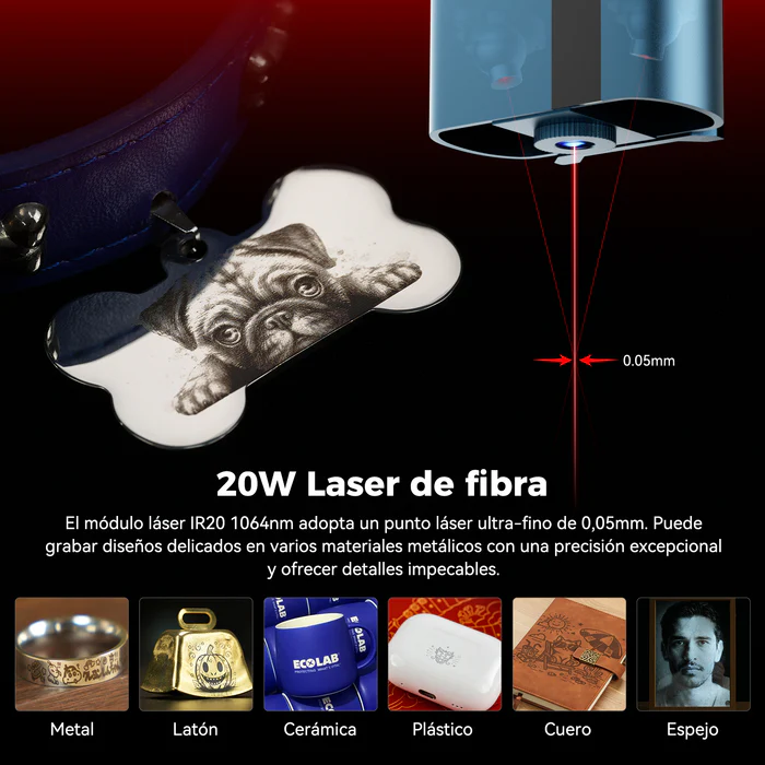 - Láser de fibra (20 W): Oro, plata, titanio, acrílico negro, plástico, aluminio, hierro, latón, platino y acero inoxidable. Funciona bien en casi todos los metales y en muchos plásticos como el plexiglás. Perfecto para joyería, accesorios y trabajos detallados en metal o plástico.