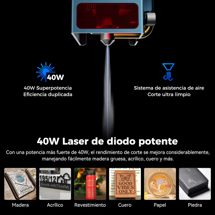 - Láser de diodo (40 W): Madera, papel, tela, cuero, cartón, bambú, MDF, roca, cerámica, jade, mármol, cemento, ladrillo, metal pintado, metal chapado, fieltro, algunos acrílicos opacos oscuros, metal revestido, vidrio oscuro, corcho, acero inoxidable. Ideal para manualidades, proyectos de bricolaje y aplicaciones decorativas.