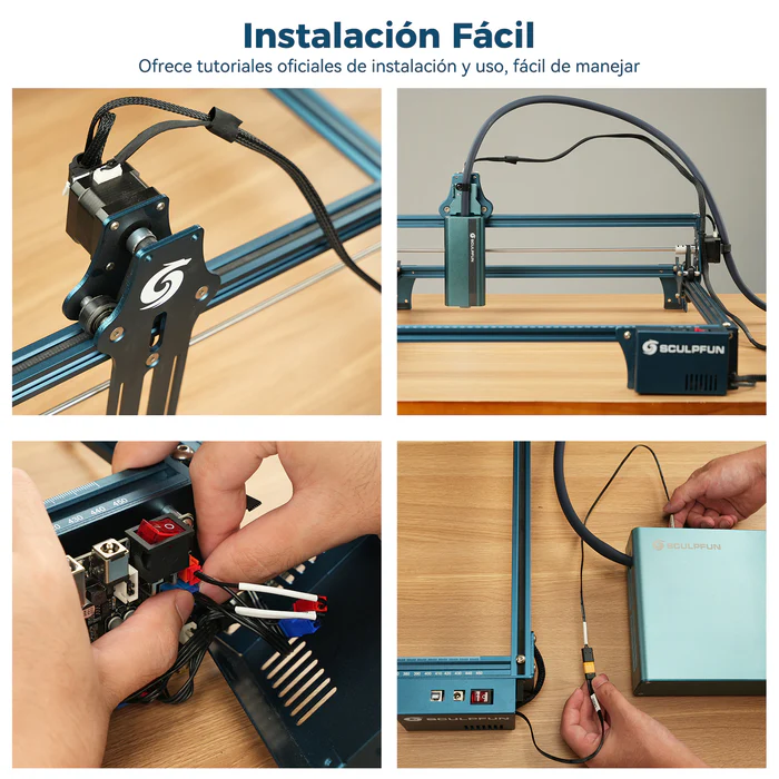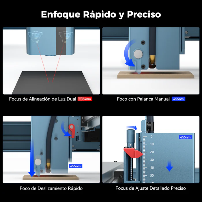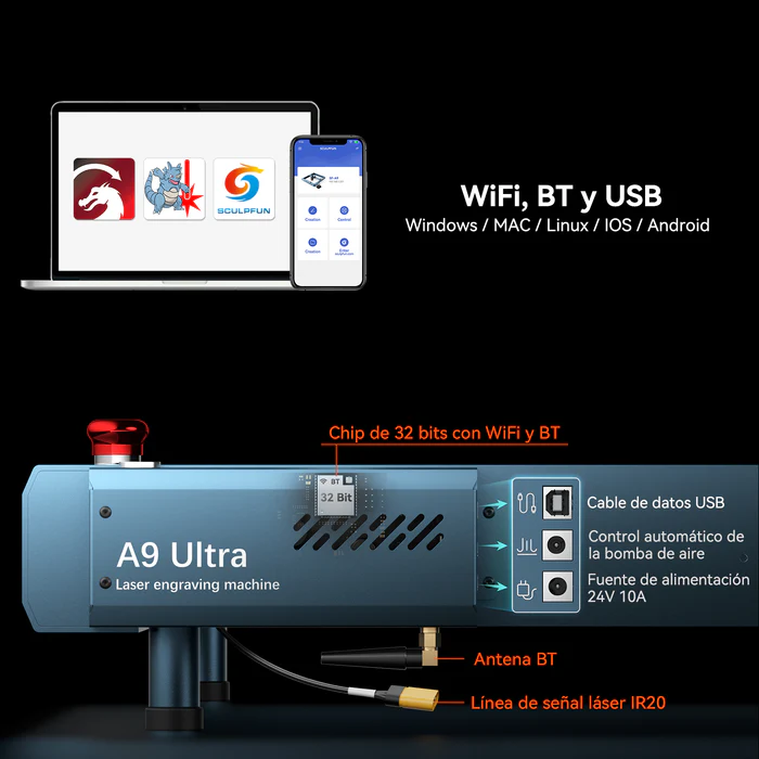 Compatible con software popular (LightBurn, LaserGRBL, etc.), con múltiples opciones de conexión (USB, Bluetooth, Wi-Fi) y compatible con diversas plataformas (Windows, macOS, iOS, Android). El diseño de enfoque manual proporciona control, mientras que el marco metálico y las patas ajustables aportan estabilidad.